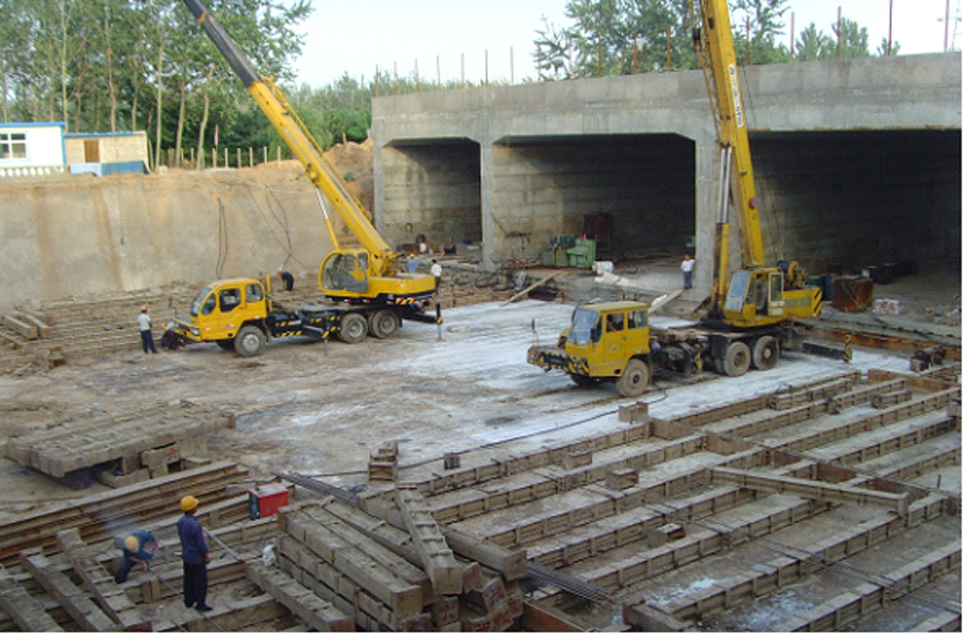 友谊北大街(北二环路-学府路)道路工程施工三标段由友谊北大街下穿石太高速公路箱涵 、排水管道、道路工程、道路照明等项目组成。总长度1700m ,工程总造价为5246.37万元。其中友谊北大街下穿石太高速箱涵位于友谊北大街与石太高速公路交叉口 ,为单箱四孔箱涵 ,箱涵长28m,宽48.7m ,高8.2m,涵孔净尺寸9m+13m+13m+9m,净高6.3m,箱涵自重为9295.2t ,箱涵采用C35防水混凝土 ,整体预制,顶进施工,该工程于2008年10月25日开工,2009年10月25日竣工。